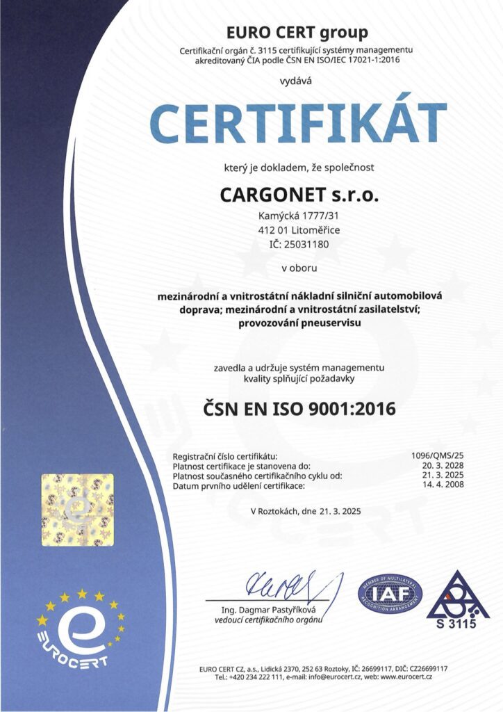 V roce 2004 jsme poprvé získali certifikát kvality poskytovaných služeb dle normy ISO 9001. Úspěšnou obhajobou tohoto certifikátu jsme docílili zlepšení kvality služeb, což je naší hlavní prioritou.